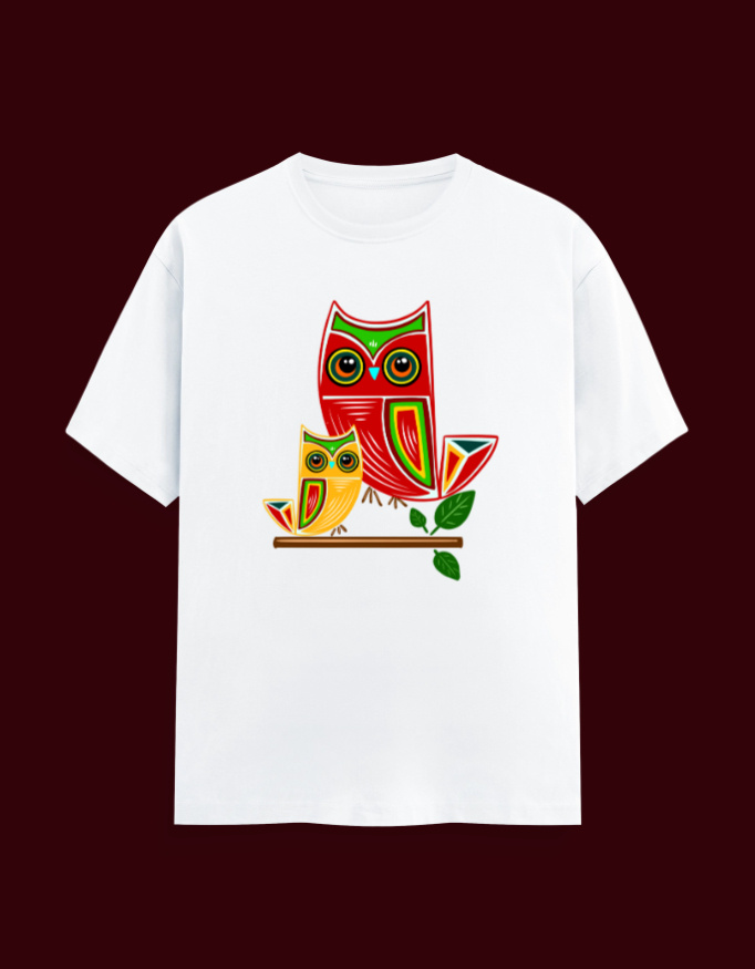 Shop Owl Graphic White T-Shirt for Pohela Boishakh. Comfortable cotton tee with cultural design. Perfect for Bengali New Year celebrations.